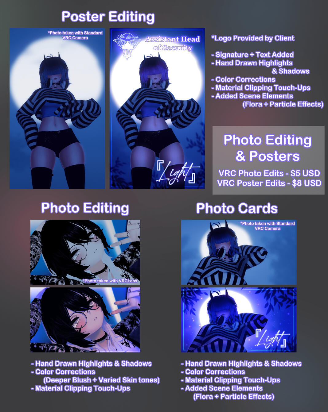 I am a digital artist! I have a special interest in character design, photo editing, and creating digital posters for online groups in the game "VRChat."I use she/they pronouns and I am 27 years old. I love interacting with fandoms online and finding new friends!If you are interested in commissioning me, please see the Commissions page for pricing, and the T.o.S. page for my terms of service!Thank you so much for visiting, and I hope you have a happy timezone! ^^
