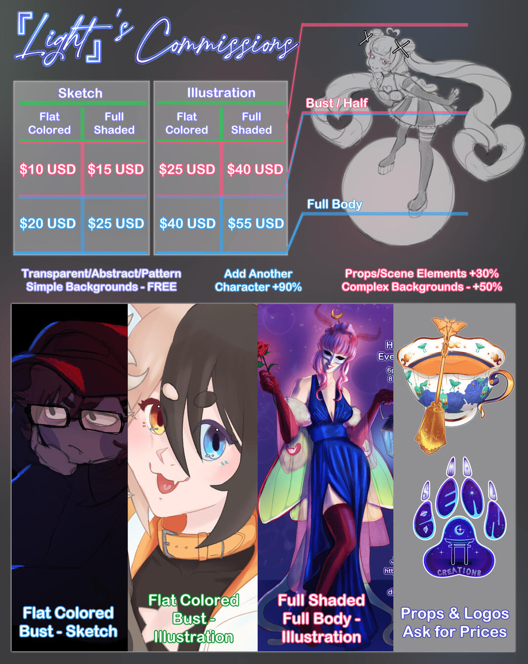 I am a digital artist! I have a special interest in character design, photo editing, and creating digital posters for online groups in the game "VRChat."I use she/they pronouns and I am 27 years old. I love interacting with fandoms online and finding new friends!If you are interested in commissioning me, please see the Commissions page for pricing, and the T.o.S. page for my terms of service!Thank you so much for visiting, and I hope you have a happy timezone! ^^